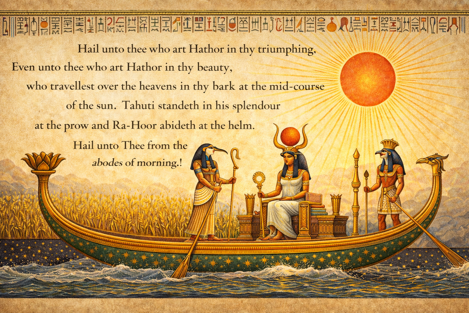 If morning is sublimation — the raising of matter — noon is fixation: the moment of maximum concentration before dissolution begins. Hathor’s presence declares: this is the hour to receive, to drink, to be filled. The prayer invites participation in radiance, not detached observation.